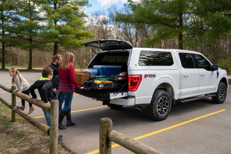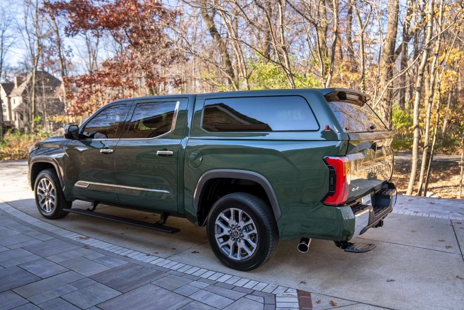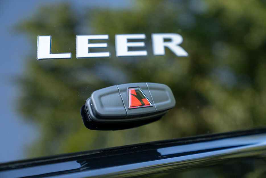 The 100XQ Sport premium cap is custom-designed to include a curved glass rear door with spoiler and integrated third brake light, large one-piece frameless tip-out side windows with screens, headliner, 20” LED tube light, LEER twist lock, and keyless entry.